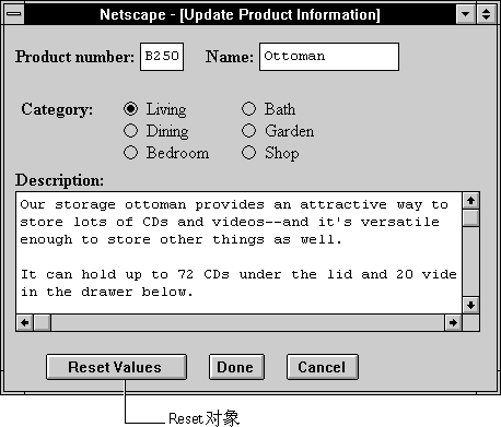 示例 2. The following example displays two Text objects, a Select object, and three radio buttons; all of these objects have default values. The form also has a reset button with the text "Defaults" on its face. If the user changes the value of any of the objects and then clicks the Defaults button, the original values are restored.